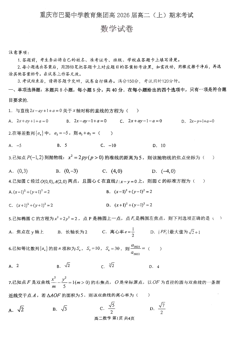 重庆市巴蜀中学教育集团2024-2025学年上学期高二期末考试数学