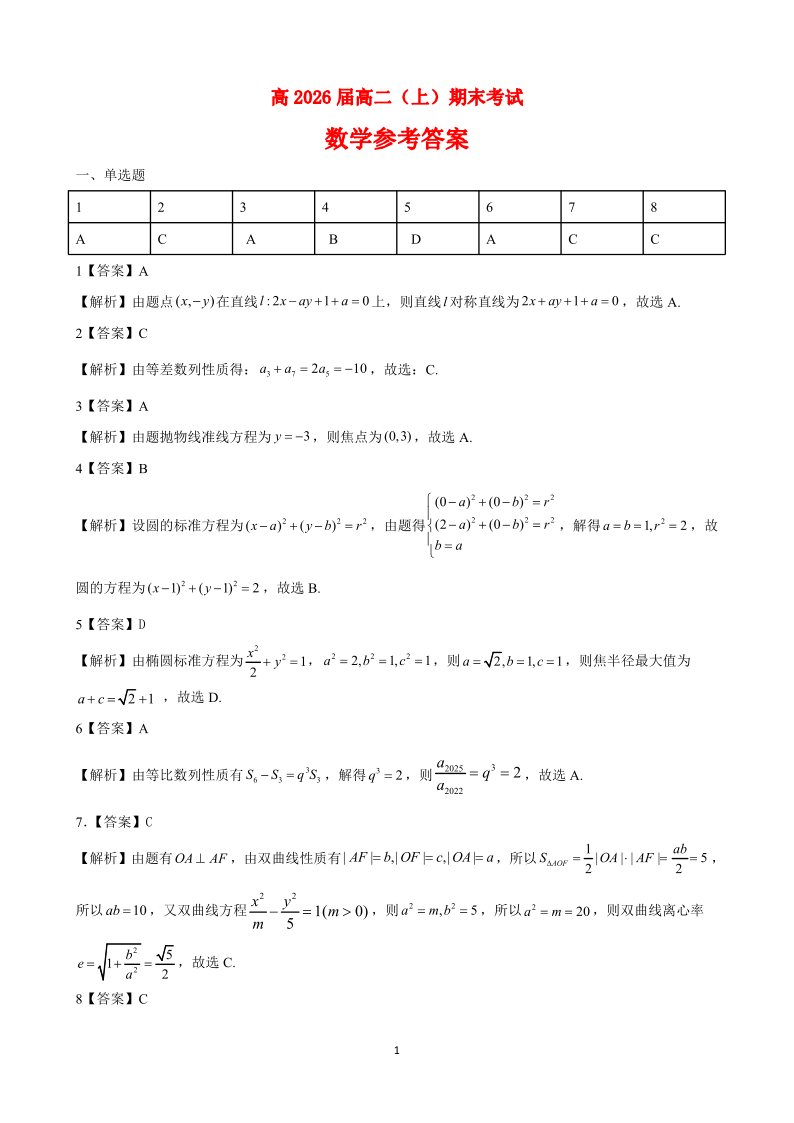 重庆市巴蜀中学教育集团2024-2025学年上学期高二期末考试数学答案