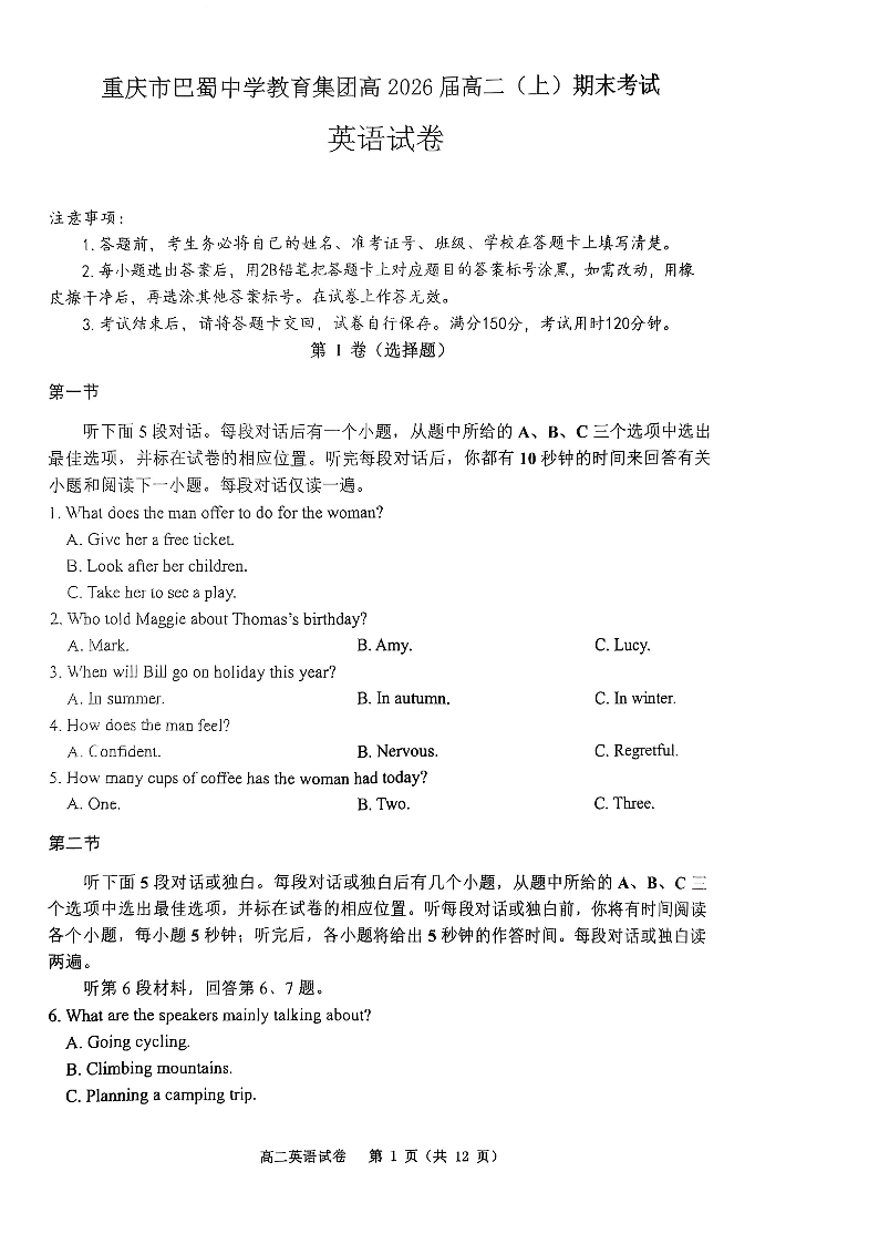 重庆市巴蜀中学教育集团2024-2025学年上学期高二期末考试英语