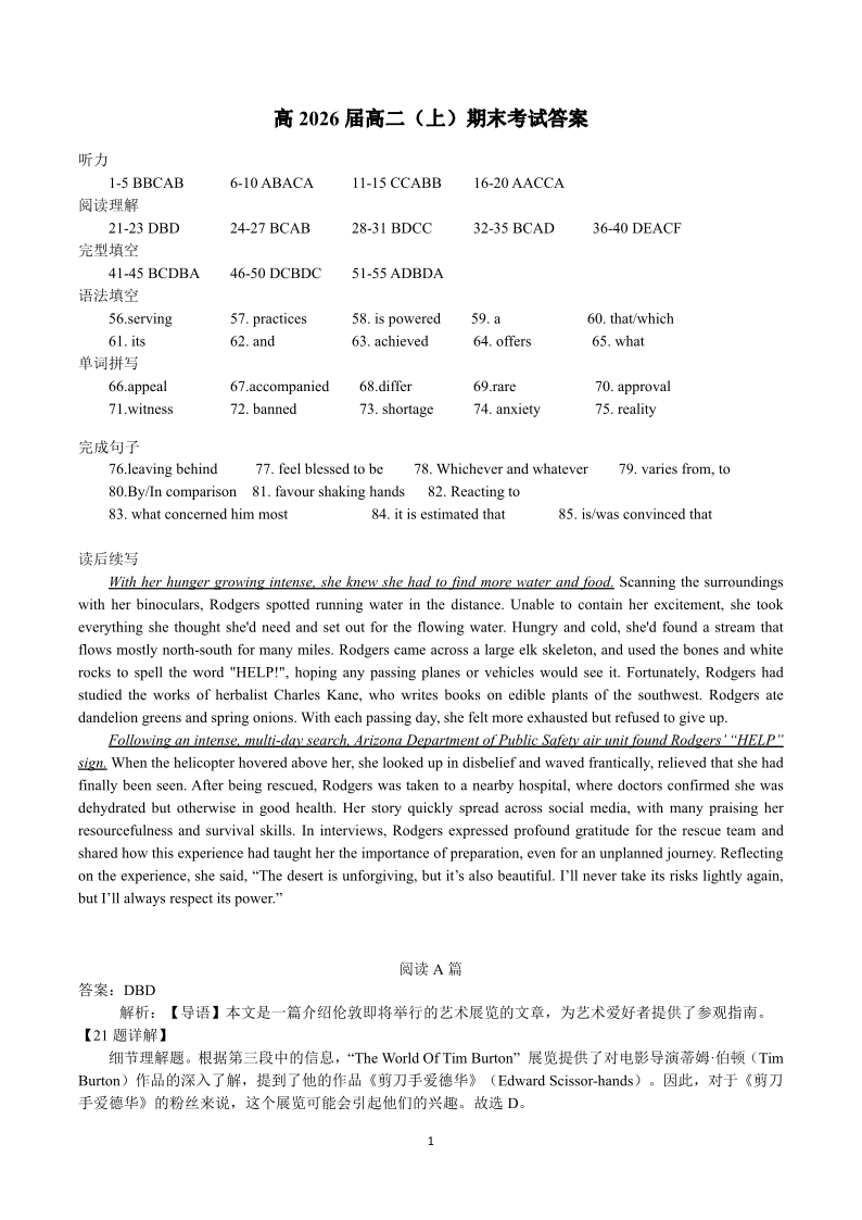 重庆市巴蜀中学教育集团2024-2025学年上学期高二期末考试英语答案