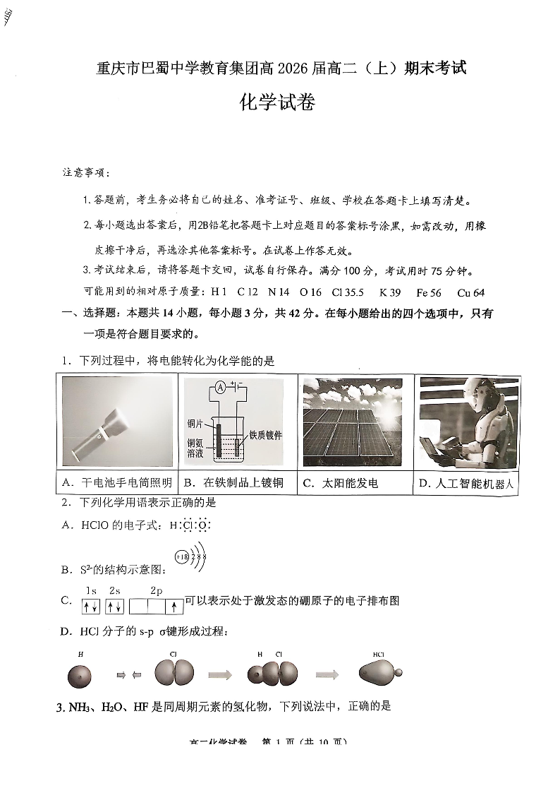 重庆市巴蜀中学教育集团2024-2025学年上学期高二期末考试化学