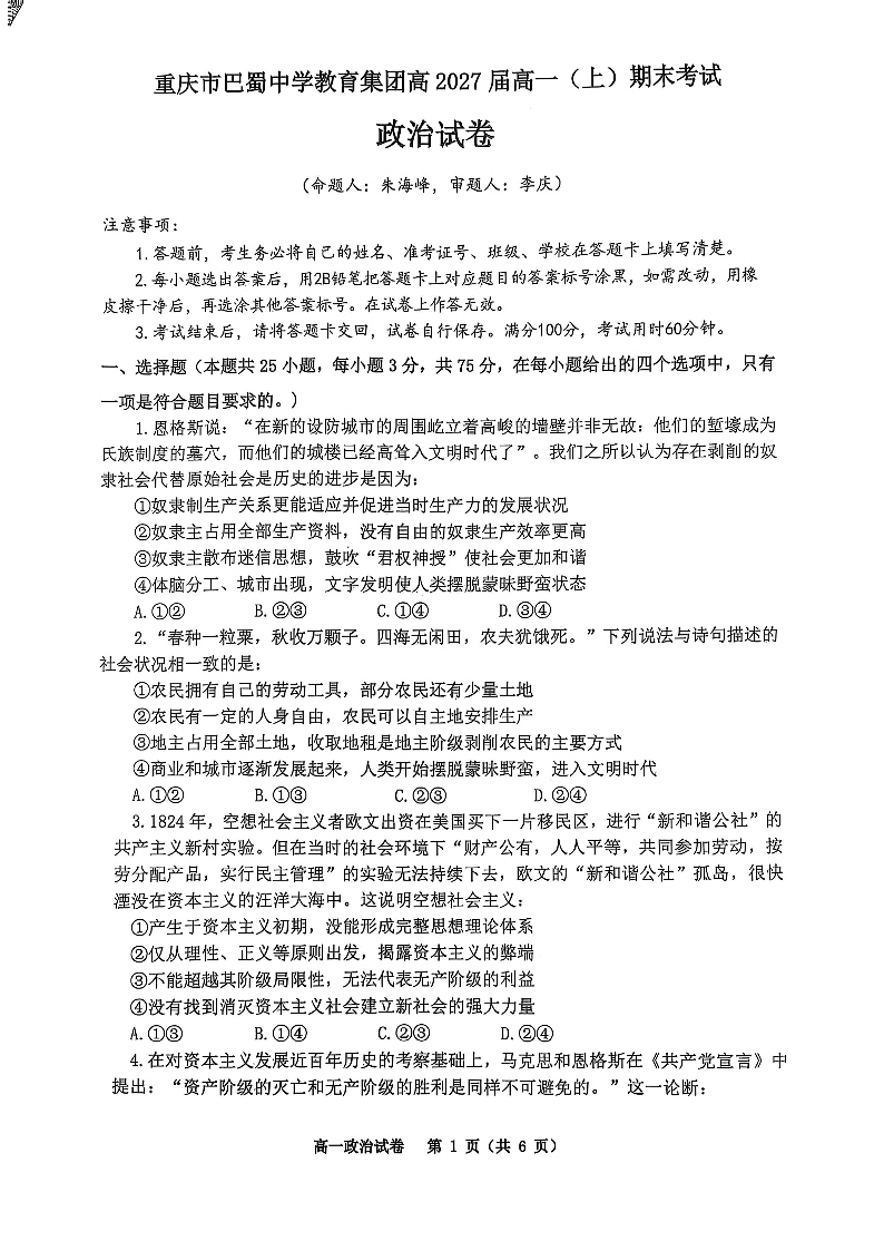 重庆市巴蜀中学教育集团2024-2025学年上学期高一期末考试政治