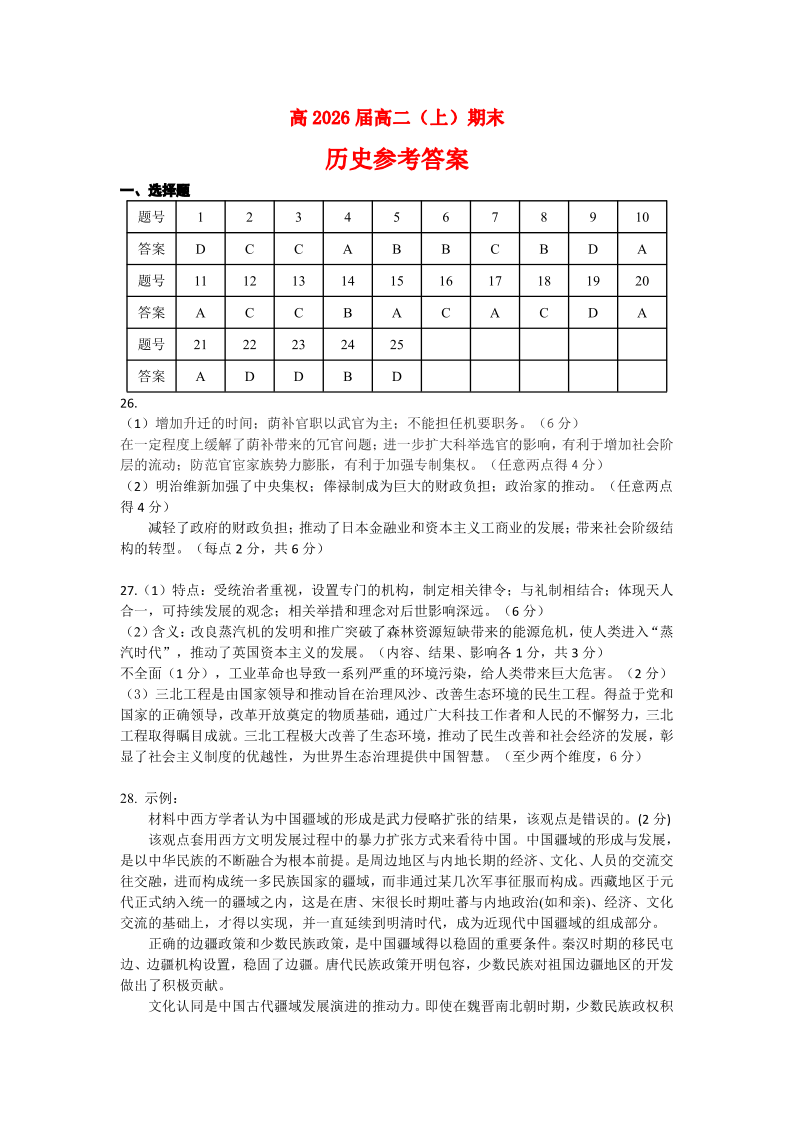 重庆市巴蜀中学教育集团2024-2025学年上学期高二期末考试历史答案