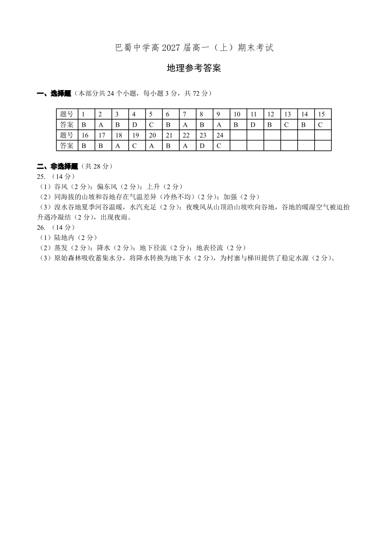 重庆市巴蜀中学教育集团2024-2025学年上学期高二期末考试地理答案