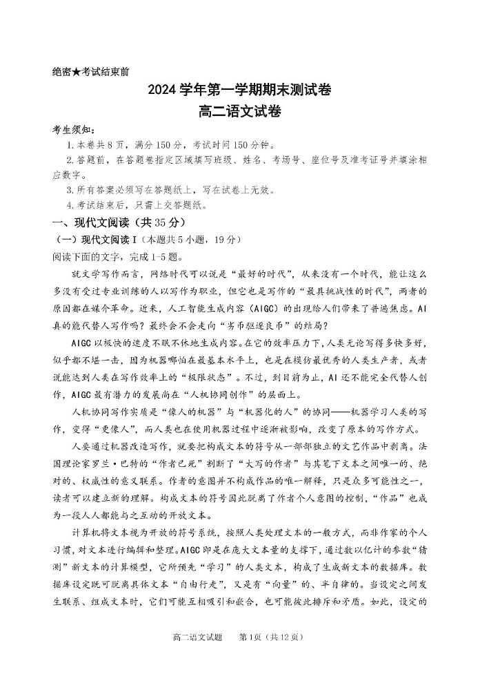 浙江省宁波市慈溪市2024-2025学年上学期1月高二期末考试语文