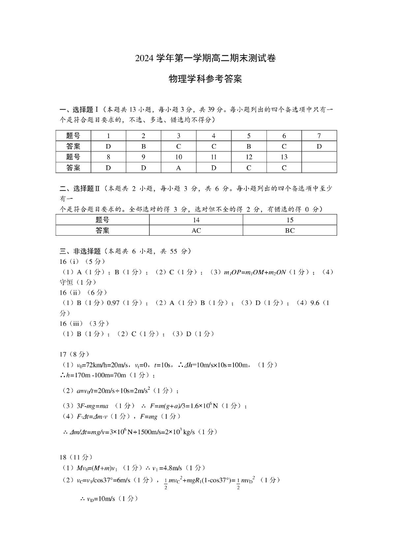 浙江省宁波市慈溪市2024-2025学年上学期1月高二期末考试物理答案