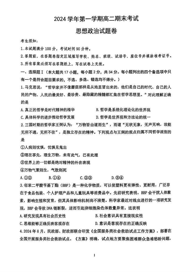 浙江省宁波市慈溪市2024-2025学年上学期1月高二期末考试政治+答案