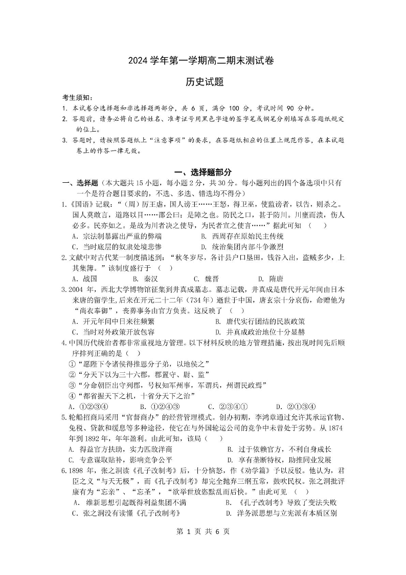 浙江省宁波市慈溪市2024-2025学年上学期1月高二期末考试历史