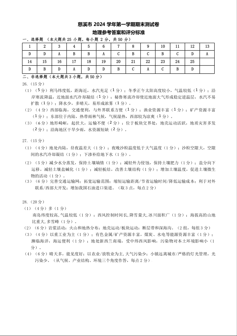 浙江省宁波市慈溪市2024-2025学年上学期1月高二期末考试地理答案