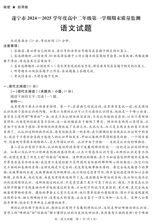 四川省遂宁市2024-2025学年上学期1月高二期末考试语文