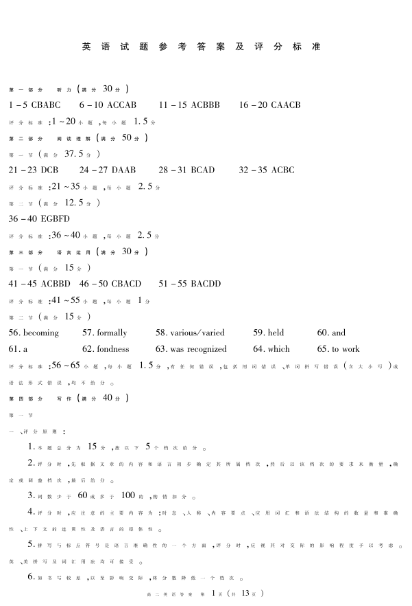 四川省遂宁市2024-2025学年上学期1月高二期末考试英语答案