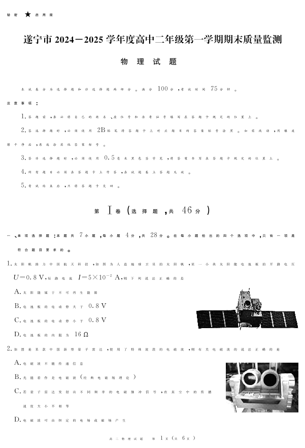 四川省遂宁市2024-2025学年上学期1月高二期末考试物理
