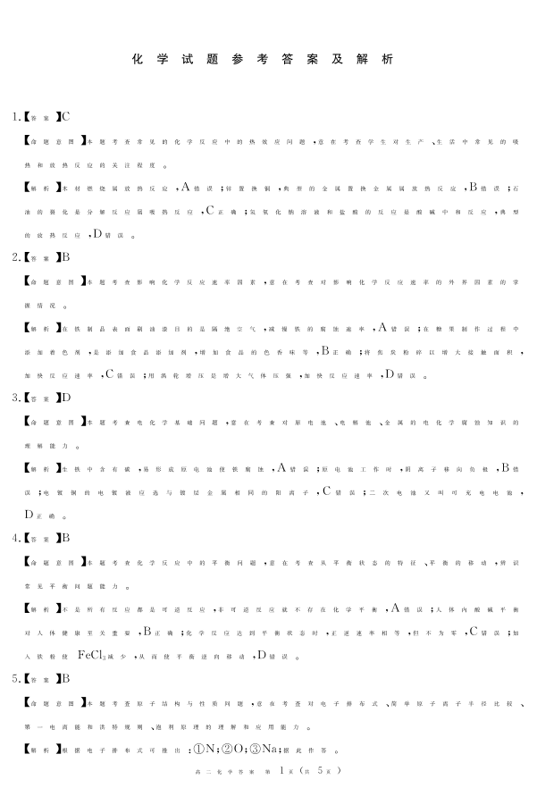 四川省遂宁市2024-2025学年上学期1月高二期末考试化学答案