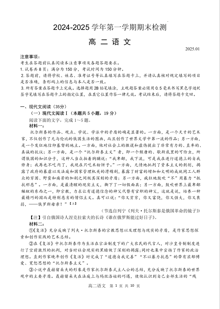 江苏省扬州市2024-2025学年上学期1月高二期末考试语文+答案