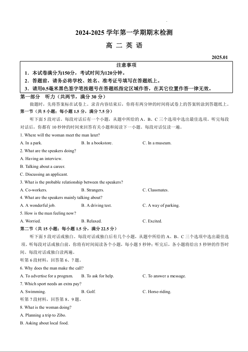 江苏省扬州市2024-2025学年上学期1月高二期末考试英语+答案