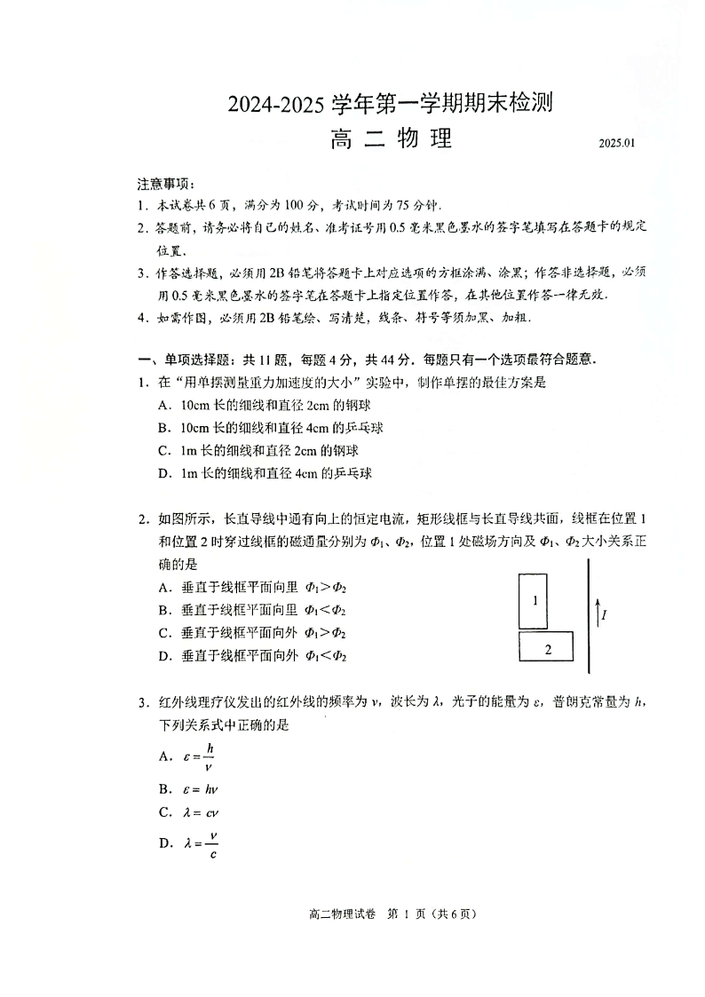 江苏省扬州市2024-2025学年上学期1月高二期末考试物理