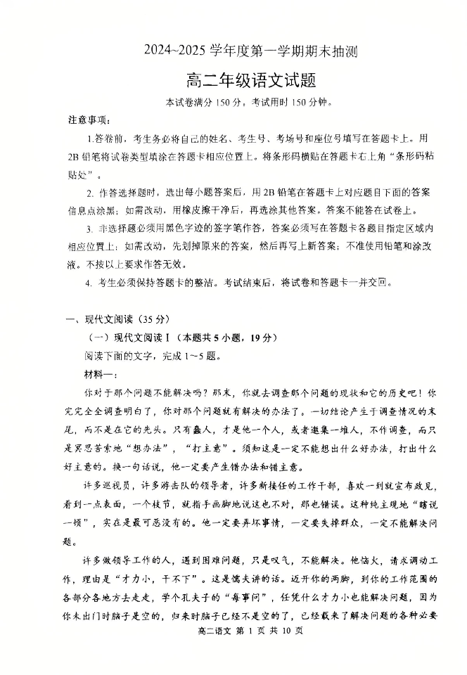 江苏省徐州市2024-2025学年上学期1月高二期末考试语文