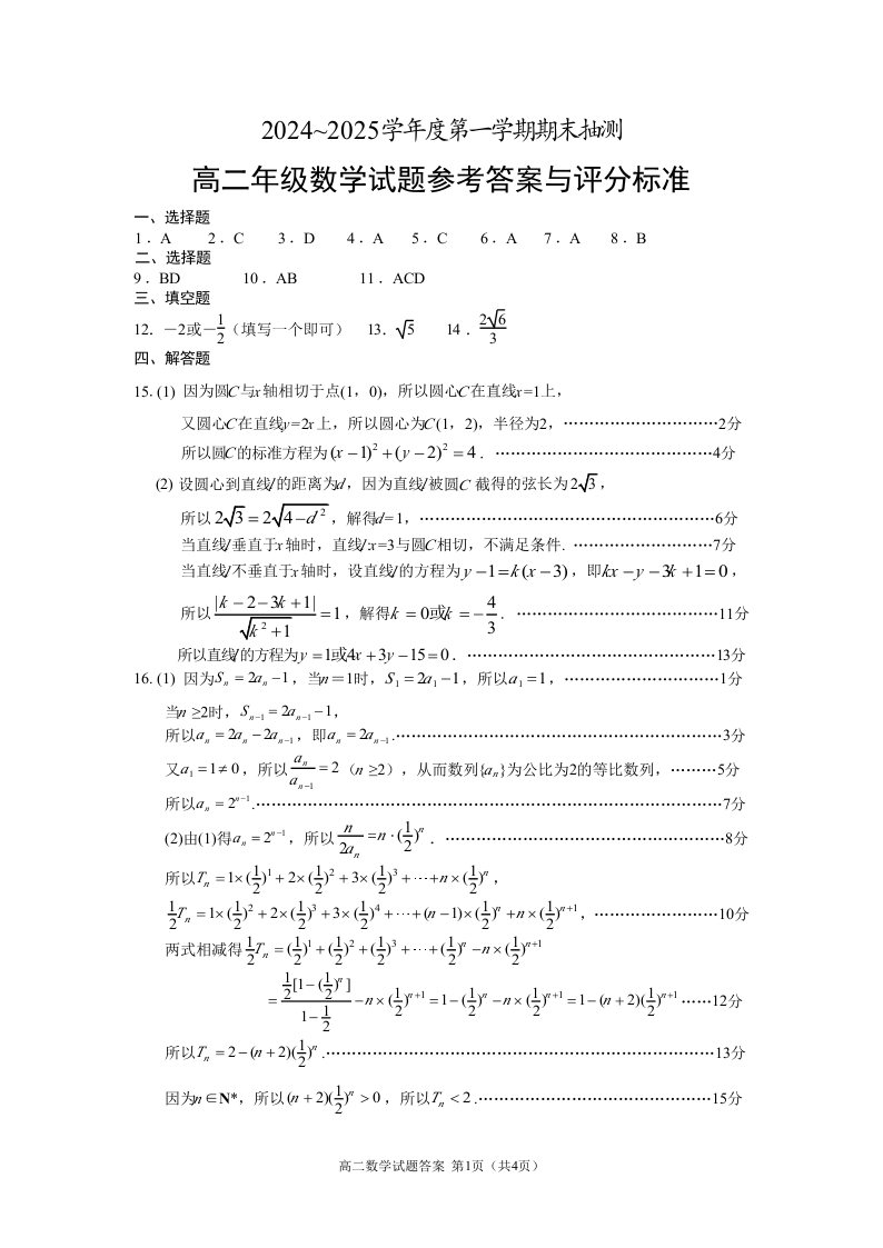 江苏省徐州市2024-2025学年上学期1月高二期末考试数学答案