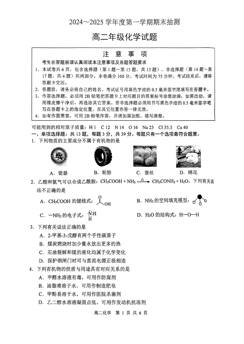 江苏省徐州市2024-2025学年上学期1月高二期末考试化学