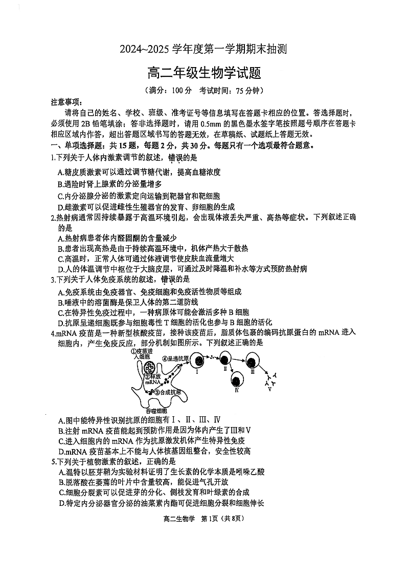 江苏省徐州市2024-2025学年上学期1月高二期末考试生物