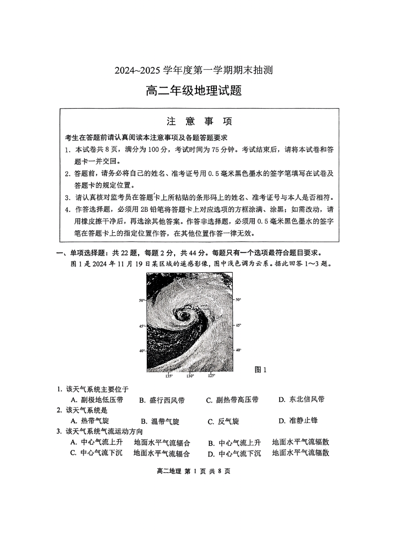 江苏省徐州市2024-2025学年上学期1月高二期末考试地理+答案