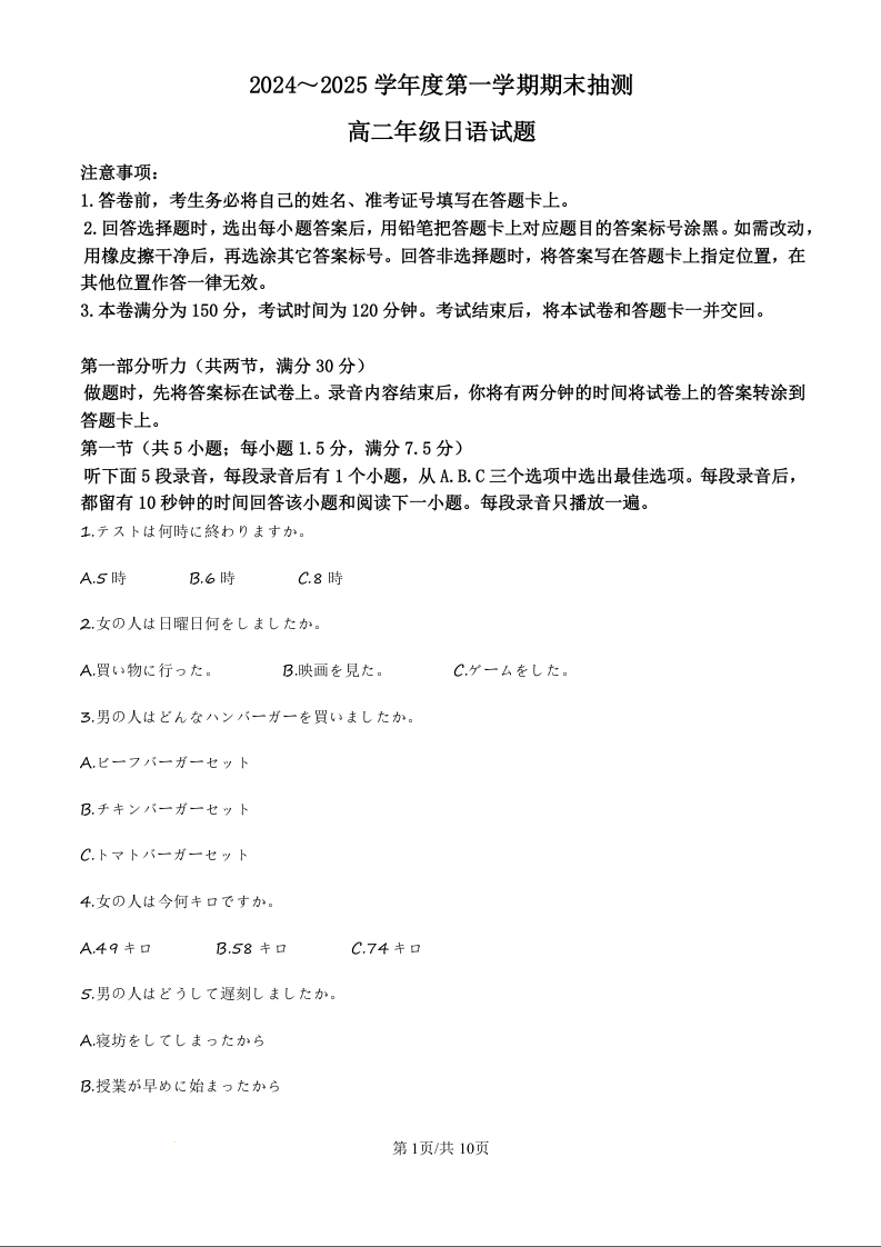 江苏省徐州市2024-2025学年上学期1月高二期末考试日语(原卷版)
