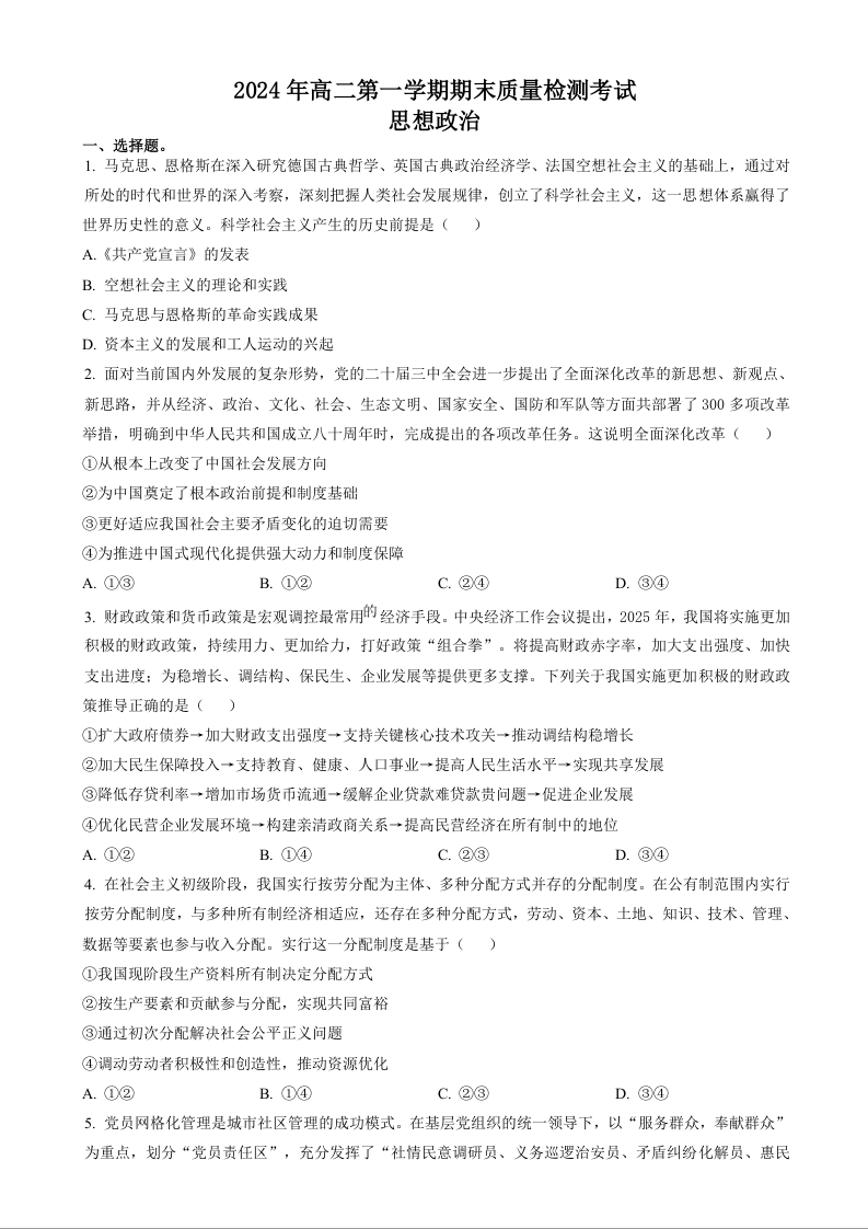 湖南省炎德英才名校联合体2024-2025学年上学高二期期末联考政治+答案