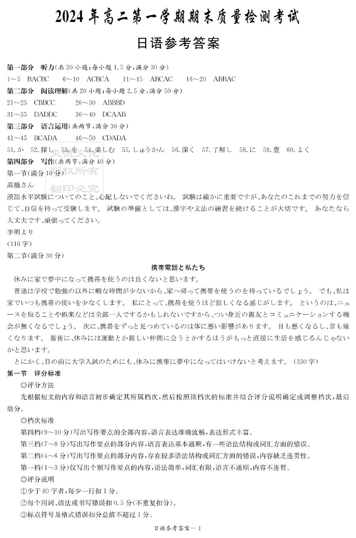 湖南省炎德英才名校联合体2024-2025学年上学高二期期末联考日语答案