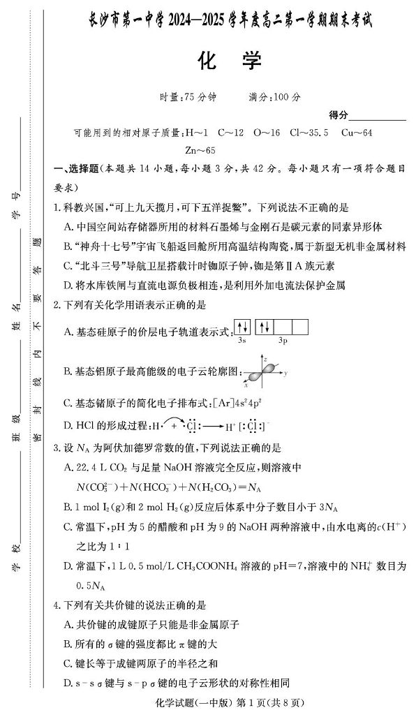 湖南省长沙市第一中学2024-2025学年上学期高二期末考试化学+答案