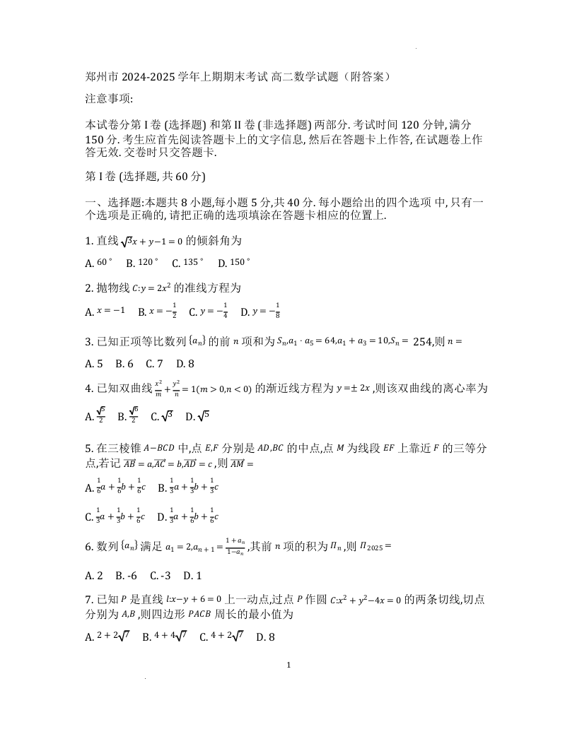 河南省郑州市2024-2025学年上学期高二期末考试数学+答案