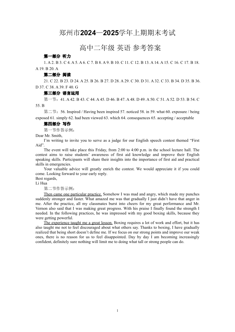 河南省郑州市2024-2025学年上学期高二期末考试英语答案