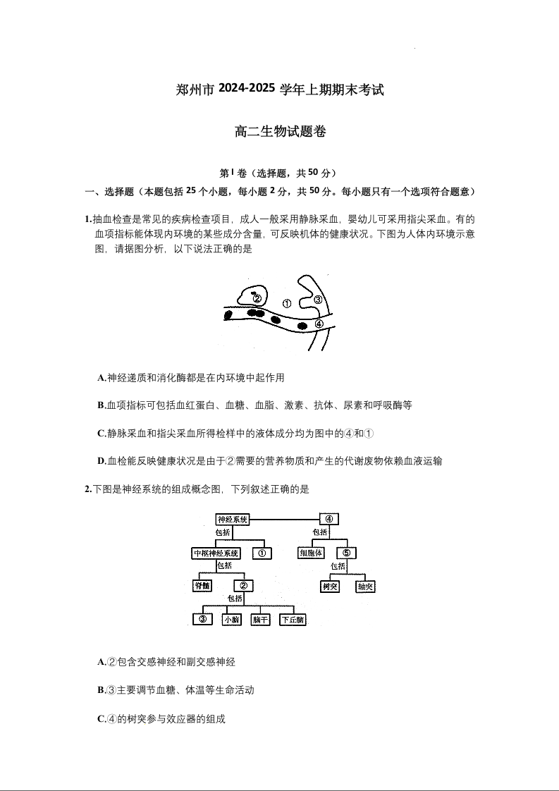 河南省郑州市2024-2025学年上学期高二期末考试生物+答案