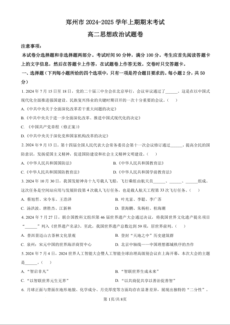 河南省郑州市2024-2025学年上学期高二期末考试政治(原卷版)
