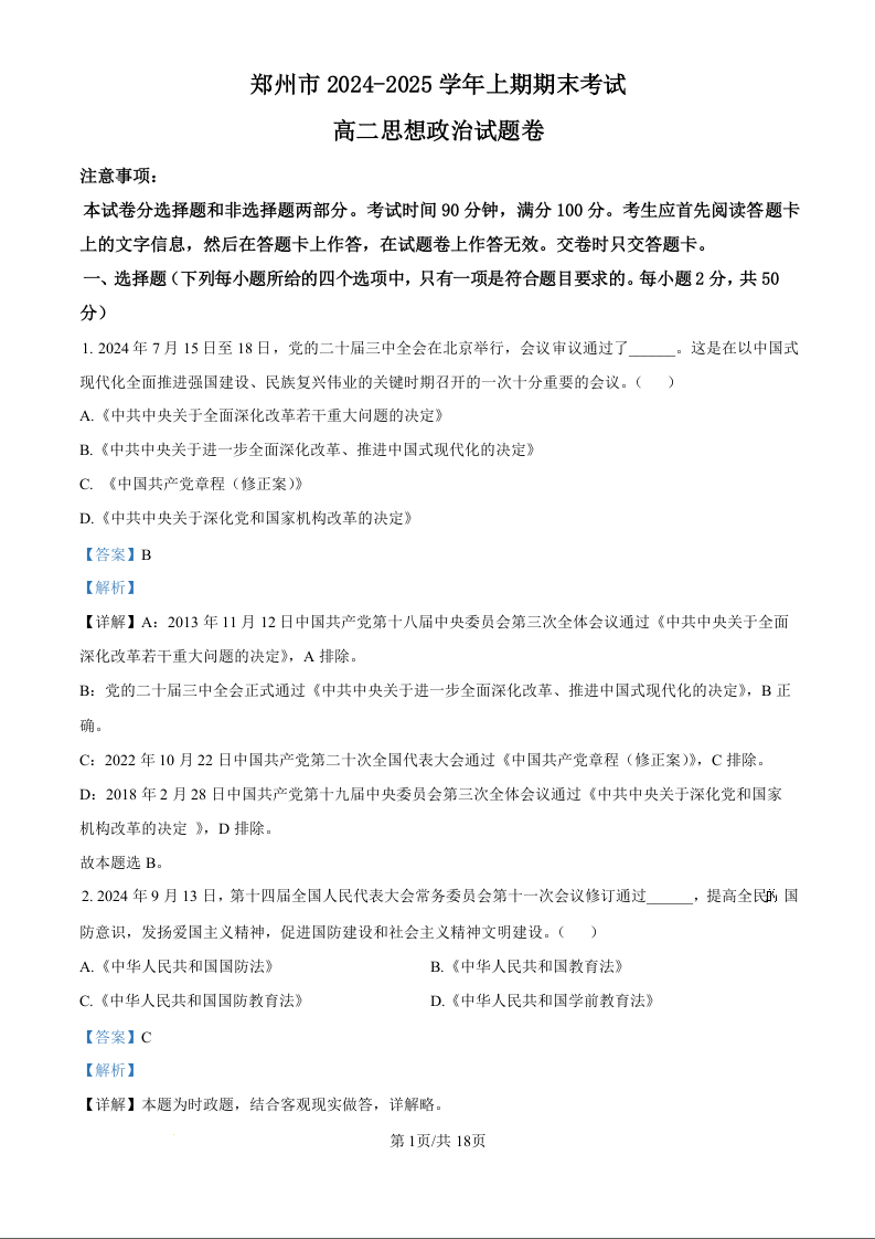 河南省郑州市2024-2025学年上学期高二期末考试政治(精品解析版)