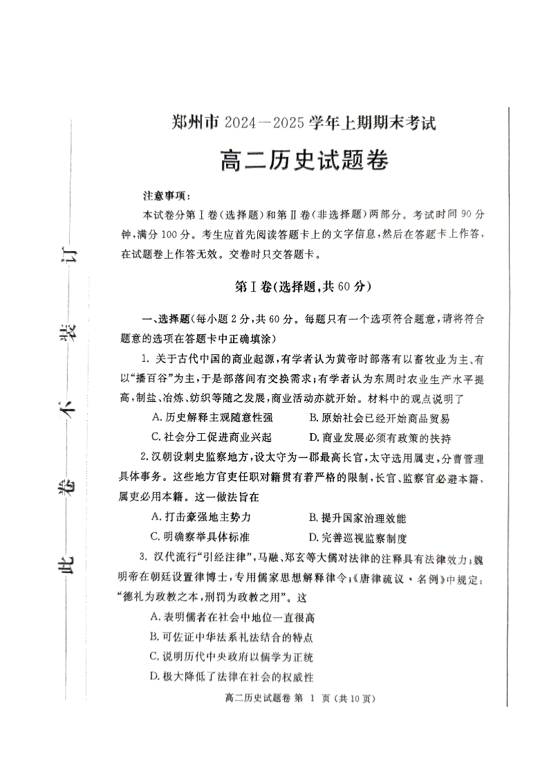 河南省郑州市2024-2025学年上学期高二期末考试历史