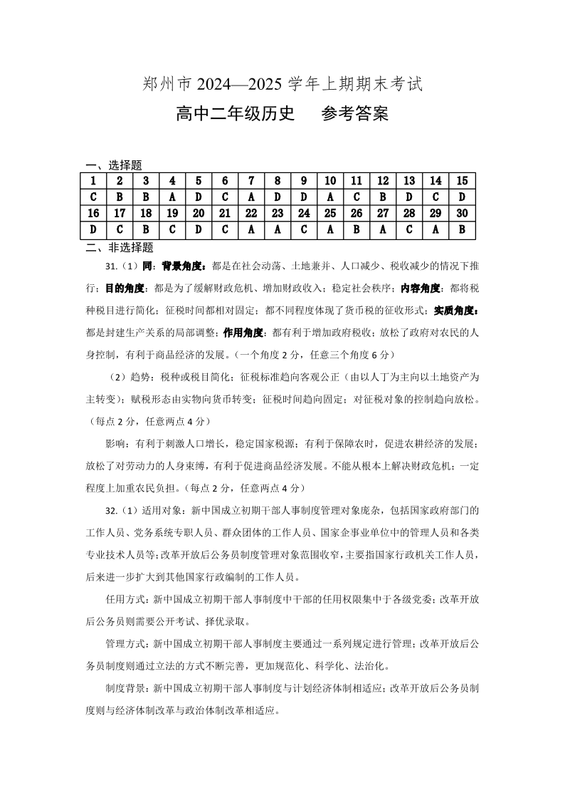 河南省郑州市2024-2025学年上学期高二期末考试历史答案