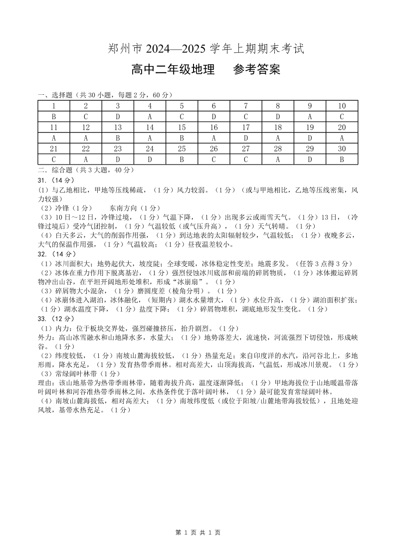 河南省郑州市2024-2025学年上学期高二期末考试地理答案