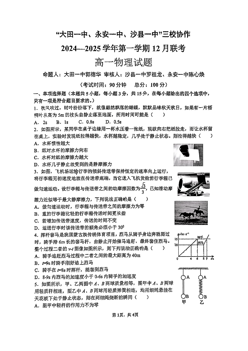 福建省三明市三校协作2024-2025学年上学期12月高一联考物理+答案