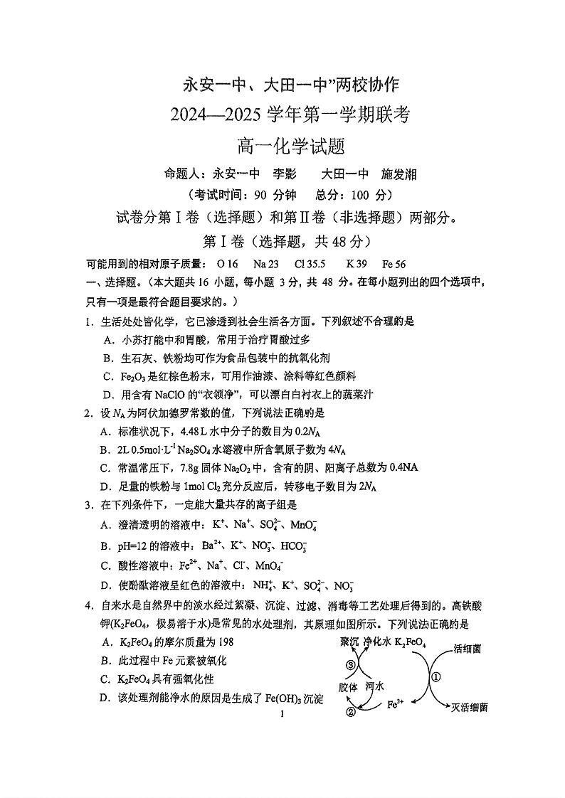 福建省三明市三校协作2024-2025学年上学期12月高一联考化学+答案