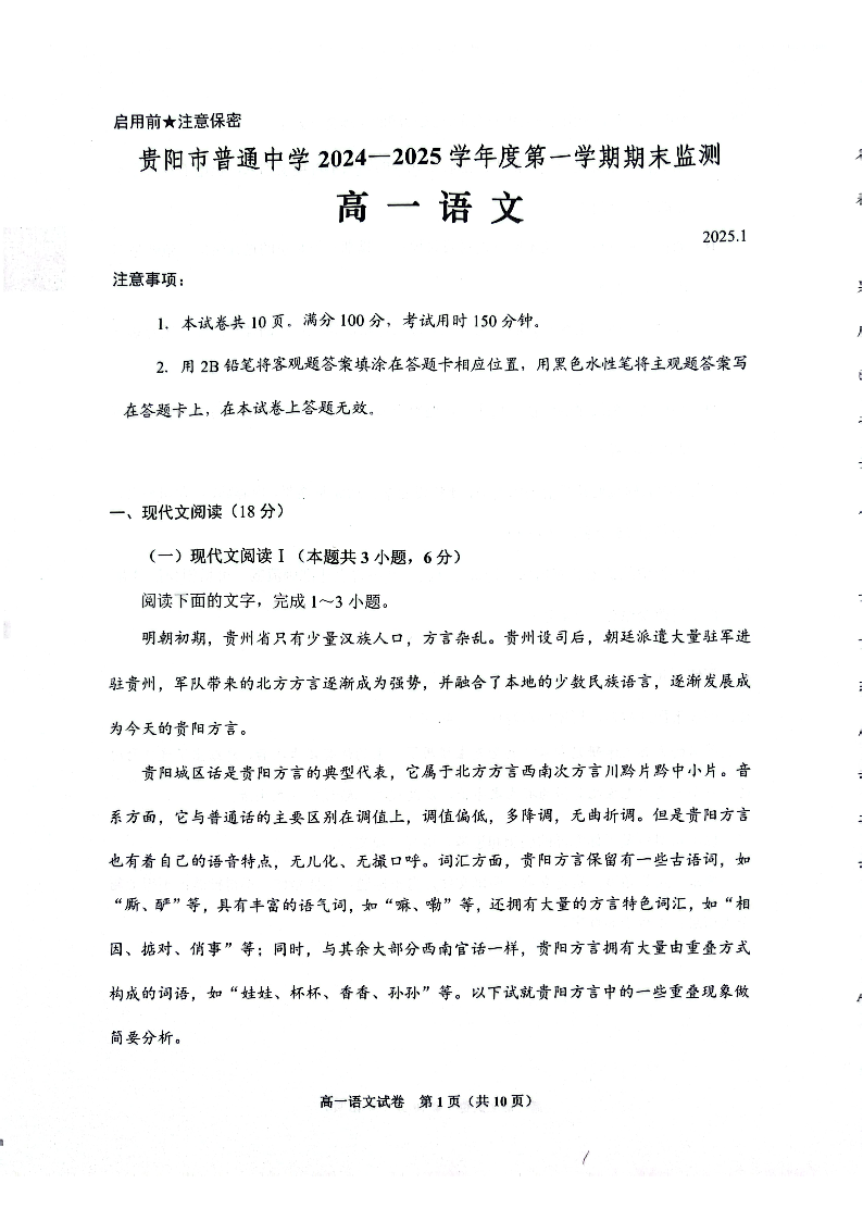贵州省贵阳市2024-2025学年上学期1月高一期末监测语文
