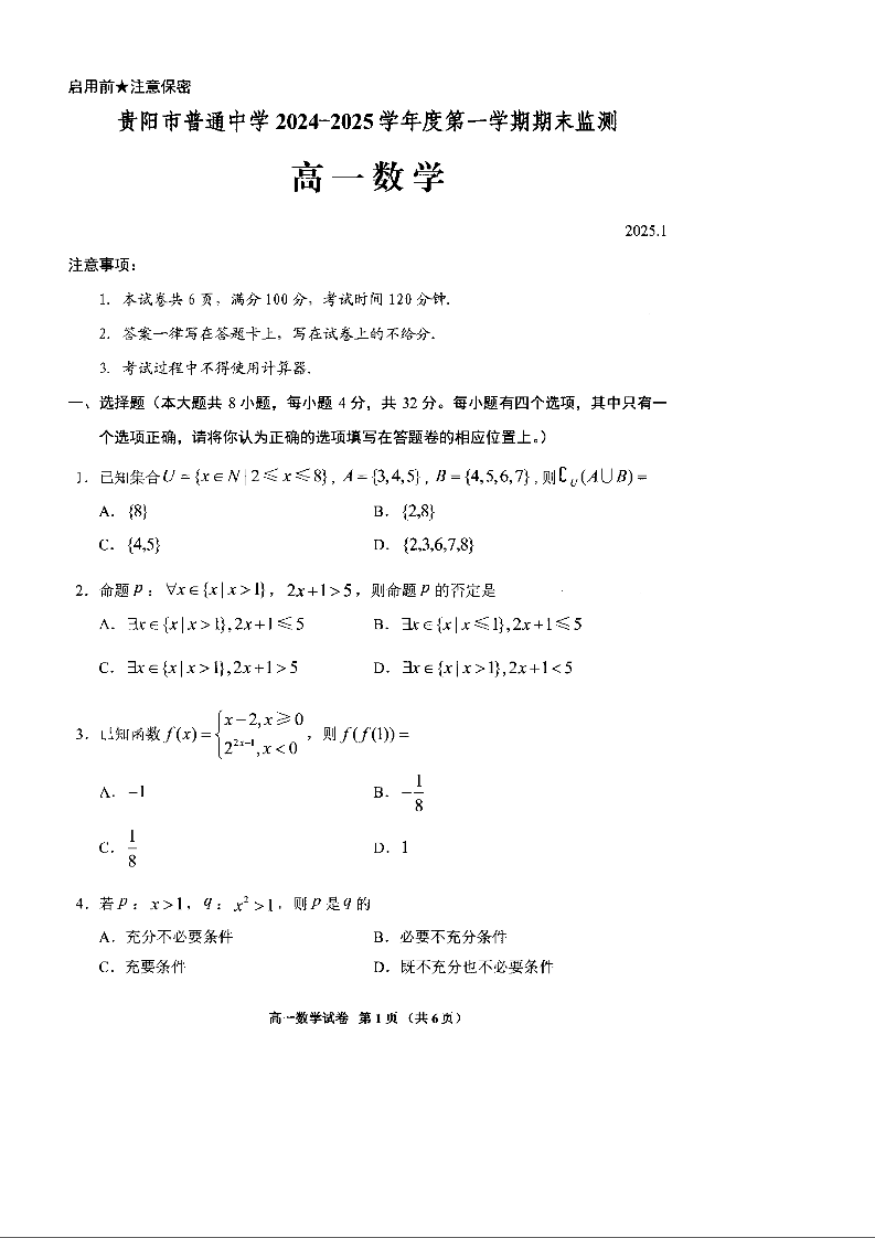 贵州省贵阳市2024-2025学年上学期1月高一期末监测数学+答案
