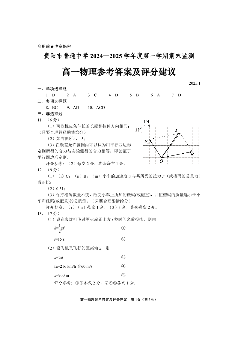 贵州省贵阳市2024-2025学年上学期1月高一期末监测物理答案