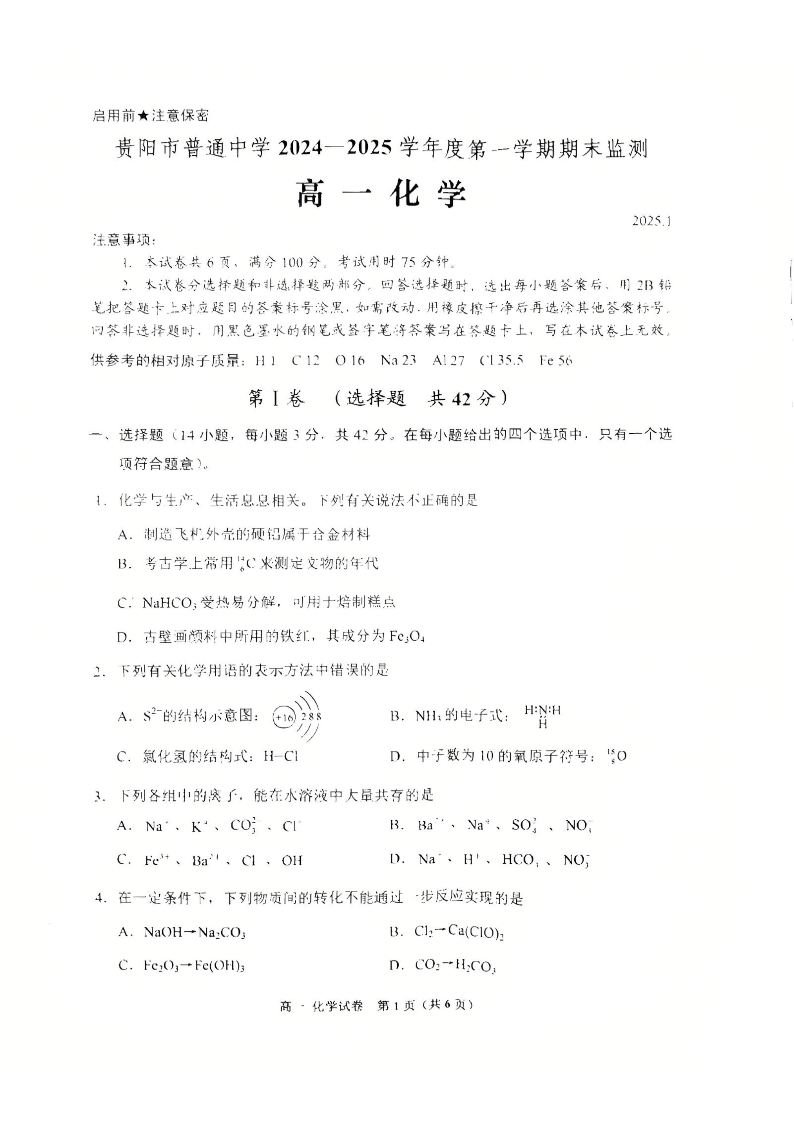 贵州省贵阳市2024-2025学年上学期1月高一期末监测化学