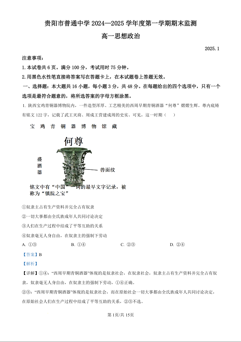 贵州省贵阳市2024-2025学年上学期1月高一期末监测政治(精品解析版)
