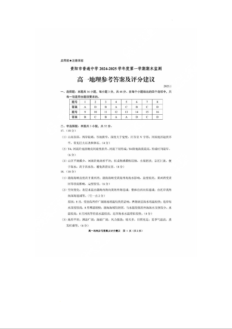 贵州省贵阳市2024-2025学年上学期1月高一期末监测地理答案