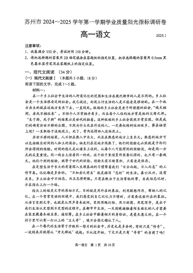 江苏省苏州市2024-2025学年上学期1月高一期末考试语文