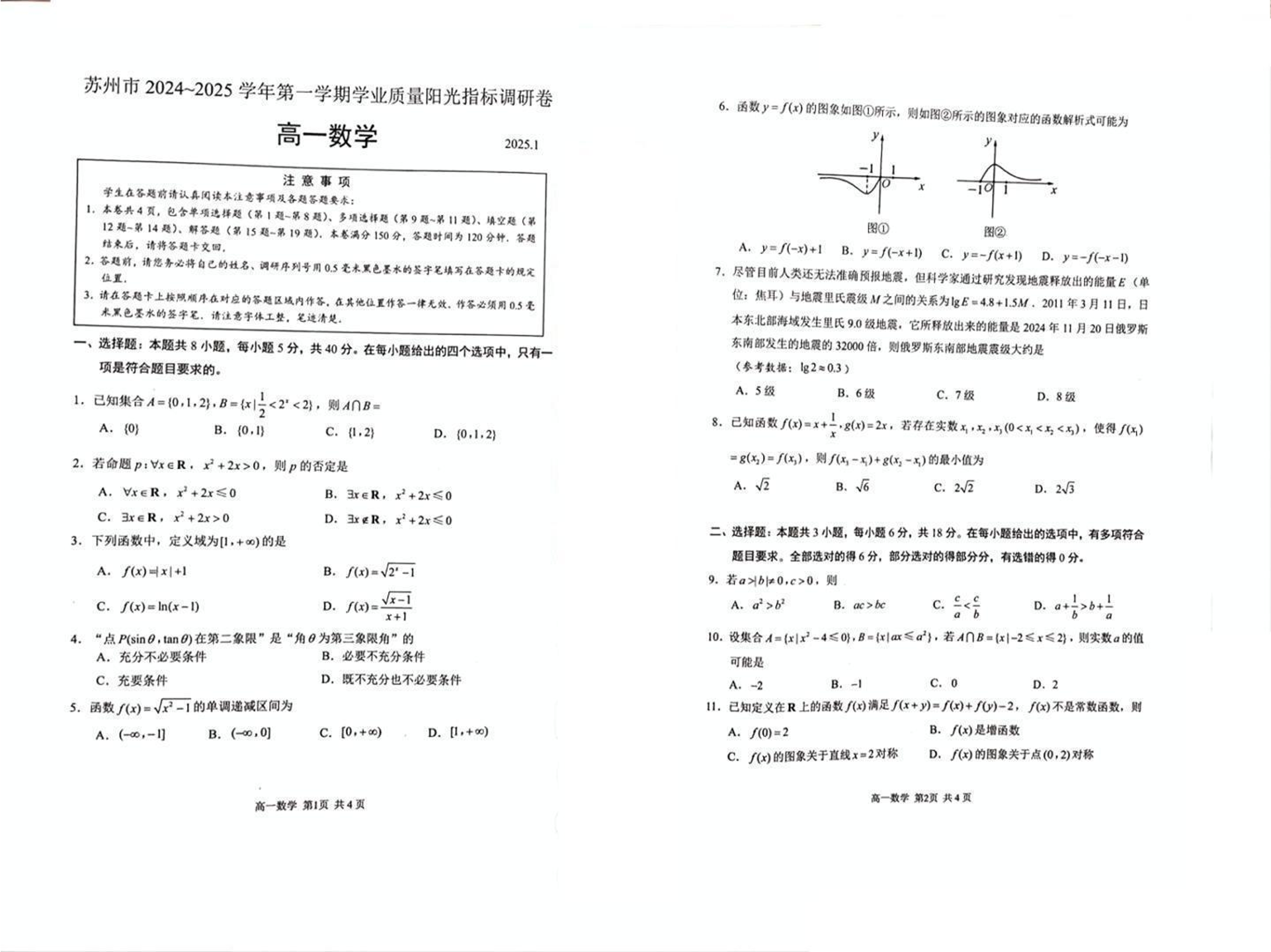 江苏省苏州市2024-2025学年上学期1月高一期末考试数学