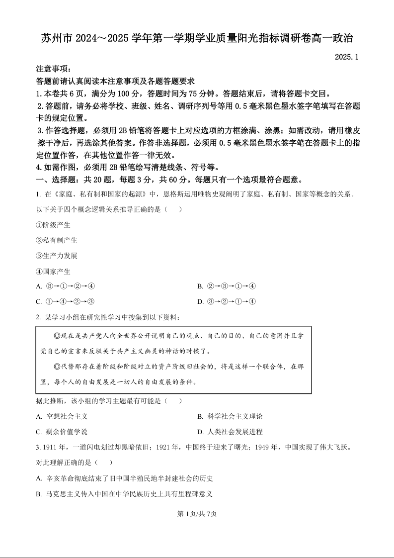 江苏省苏州市2024-2025学年上学期1月高一期末考试政治(原卷版)
