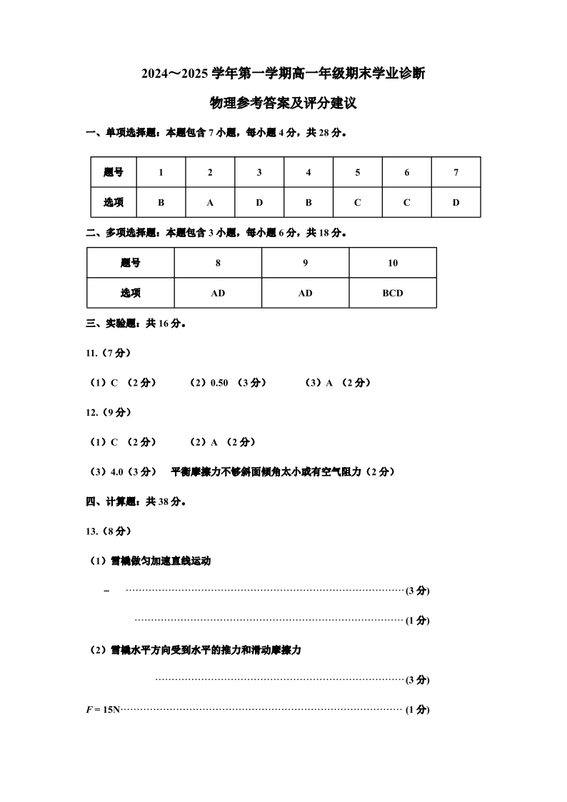 山西省太原市2024-2025学年上学期1月高一期末考试物理答案