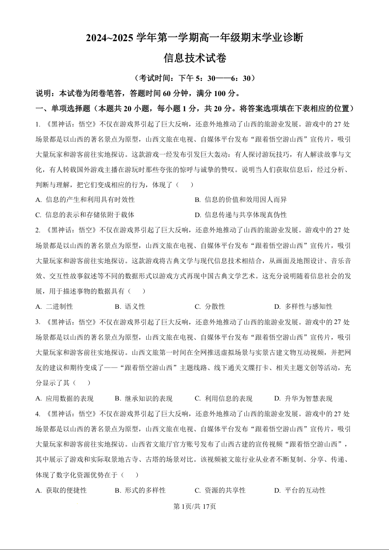 山西省太原市2024-2025学年上学期1月高一期末考试技术(原卷版)